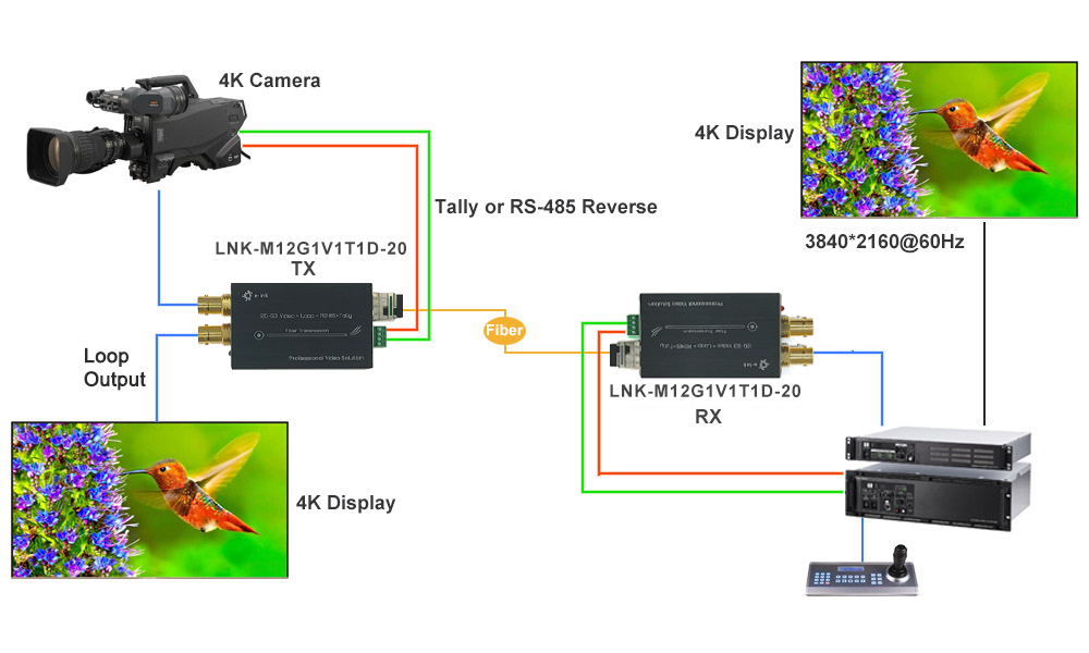 LNK-M12G-1V1T1D Mini-type 12G-SDI Fiber Converter supports 1Ch 12G Video (audio embedded), 1Ch Tally signal and 1Ch Backward RS485 transmitted via fiber optical cable, and monitor the signal locally over a 12G loop output. E-link 12G Video over Fiber Converters includes one transmitter and one receiver for HDTV 4K*2K(3840*2160@60Hz), 1080P,1080I, 720P.