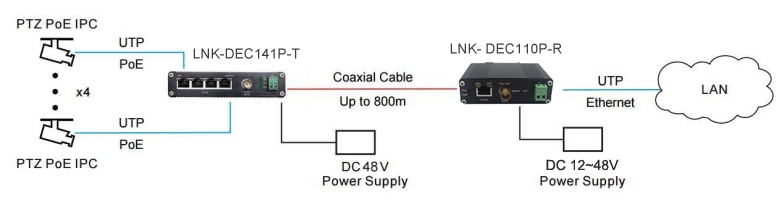 The LNK-DEC141P-T-T Series Industrial DIN-Rail EOC Transmitter product provides Ethernet Extension of 1-CH 10/100Base-TX over Coaxial cable (1Km max.). The products provide high power PoE (30W max Power Sourcing Equipment (PSE)) to the network camera. The product is good for retrofit of analogue system by using the existing cable infrastructure.