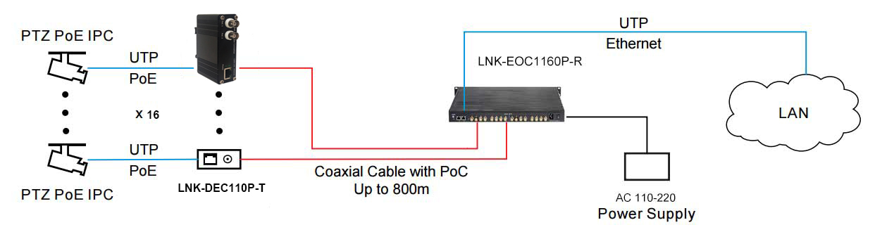 ► Power over Coaxial (LNK-EOC1160P 16P: Max. 800W total output)