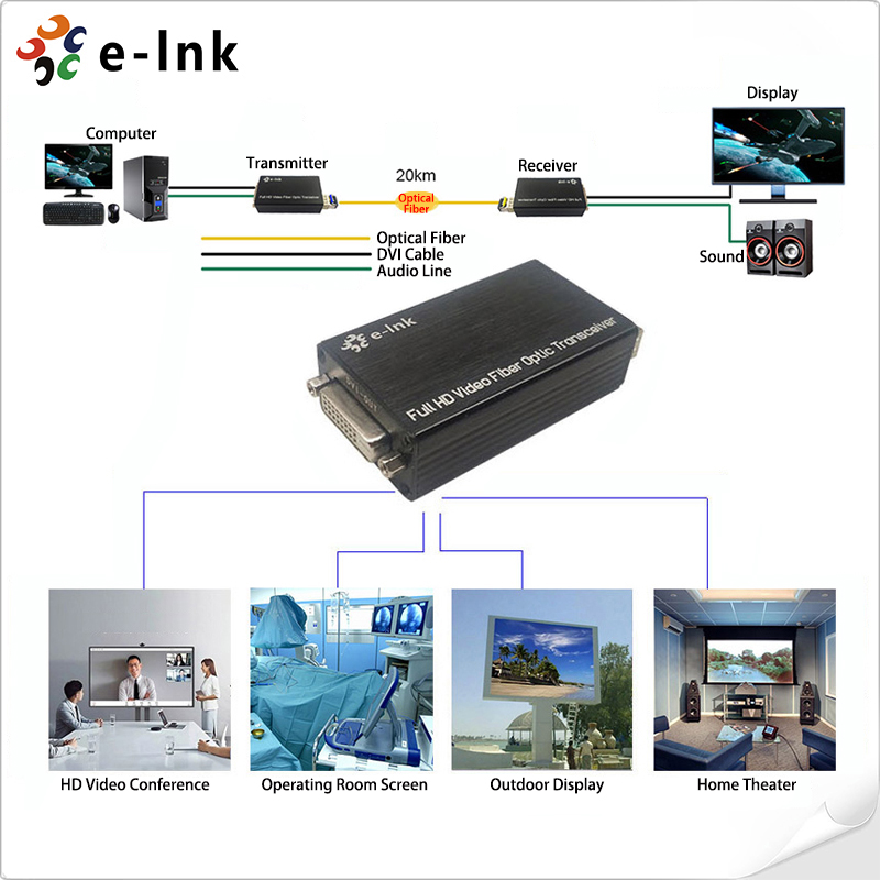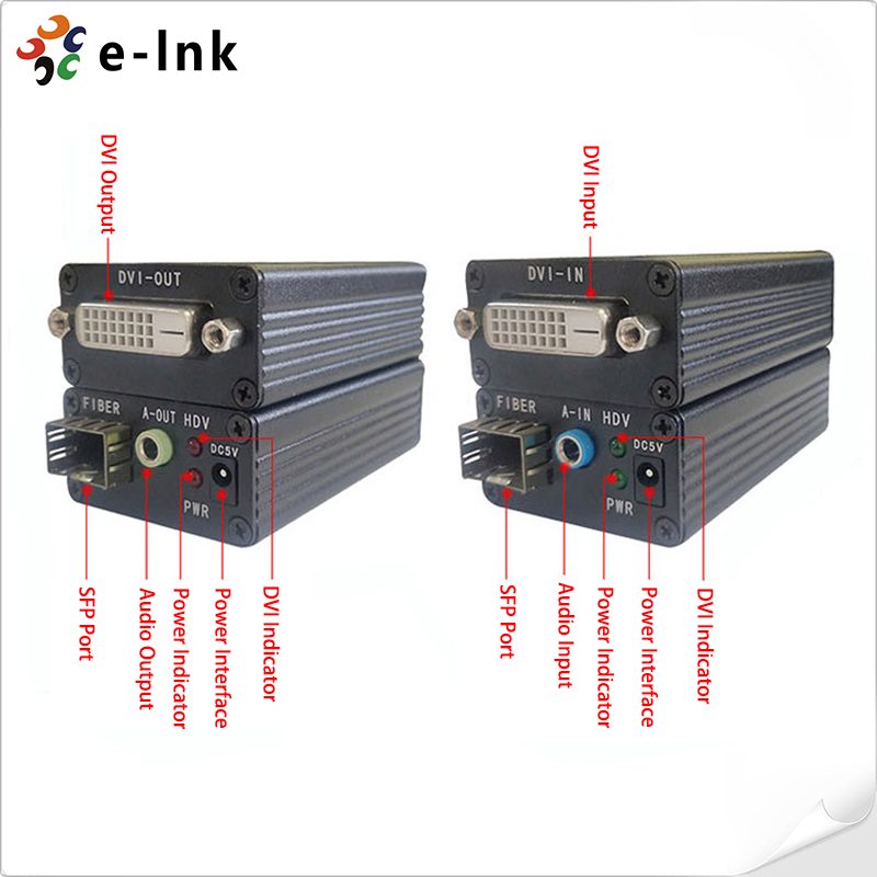 DVI Fiber Optic Extender with external stereo audio:1920*1080P@60Hz, Compliance with DVI 1.0 & HDCP1.2 standard, LC(SFP), single mode, single fiber, 20km, including 1 transmitter & 1 receiver, used by pairs |