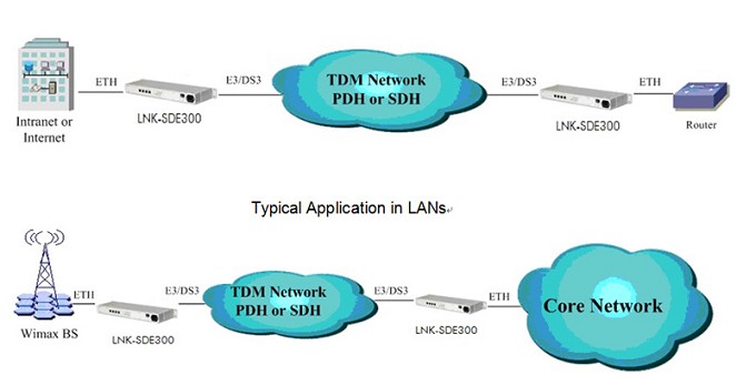 LNK-SDE300 is cost-effective intelligent converter which offers a cost-effective connection between E3/DS3 services and 10/100BaseT LANs. They enable service providers and ISPs to provide transparent Ethernet services without interfering with user traffic. In addition to point to point application, the equipment can also work with center device H0FL-P as a terminal device with 16 service directions.