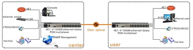 Managed PDH Multiplexer, 1 Fiber port (SFP), 4E1 (75ohm or 120ohm) + 4GE (10/100/1000M Ethernet) + Console, SFP Slot (not including SFP Module), 19" Rack, DC-48V or AC220V, support SNMP Management |