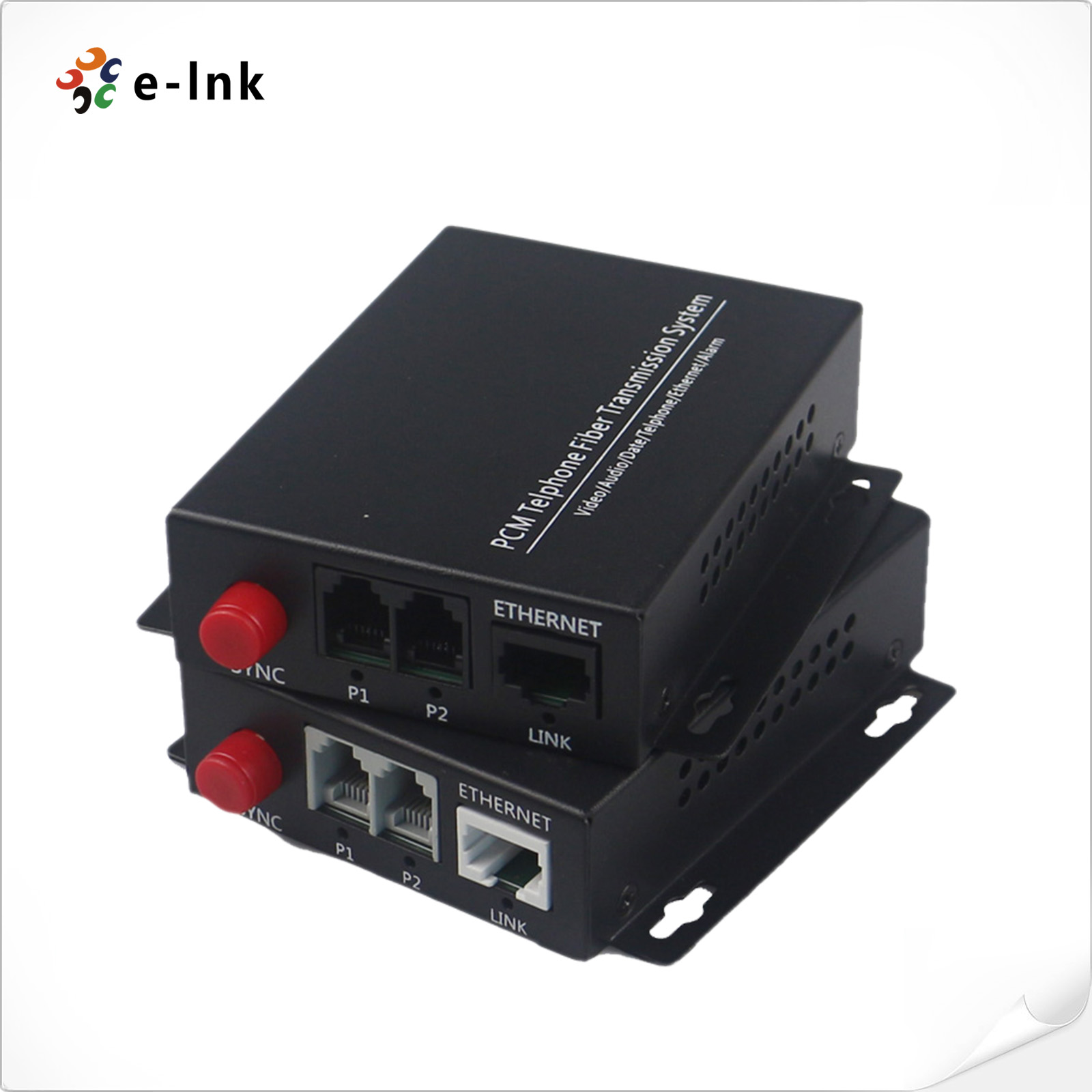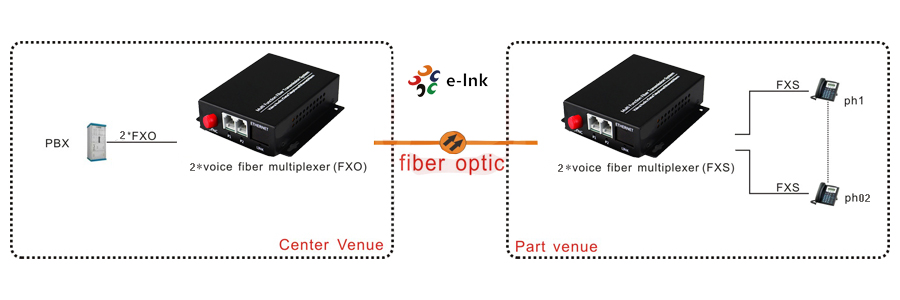E-link 2 channel POTS (Plain Old Telephone System) phone lines over fiber converter/extender. This Voice over Fiber converter uses RJ-11C modular connectors for each copper pair connection. FXO type unit connects to a telephone line (PSTN) or PBX station line and has ability to detect ringing voltages and to act as a telephone. FXS type unit is the reciprocal unit and has ability to act as PSTN and connects to a telephone device.Features
