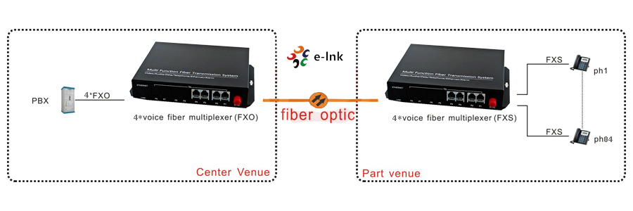 E-link 4 channel POTS (Plain Old Telephone System) phone lines over fiber converter/extender. This Voice over Fiber converter uses RJ-11C modular connectors for each copper pair connection. FXO type unit connects to a telephone line (PSTN) or PBX station line and has ability to detect ringing voltages and to act as a telephone. FXS type unit is the reciprocal unit and has ability to act as PSTN and connects to a telephone device.Features