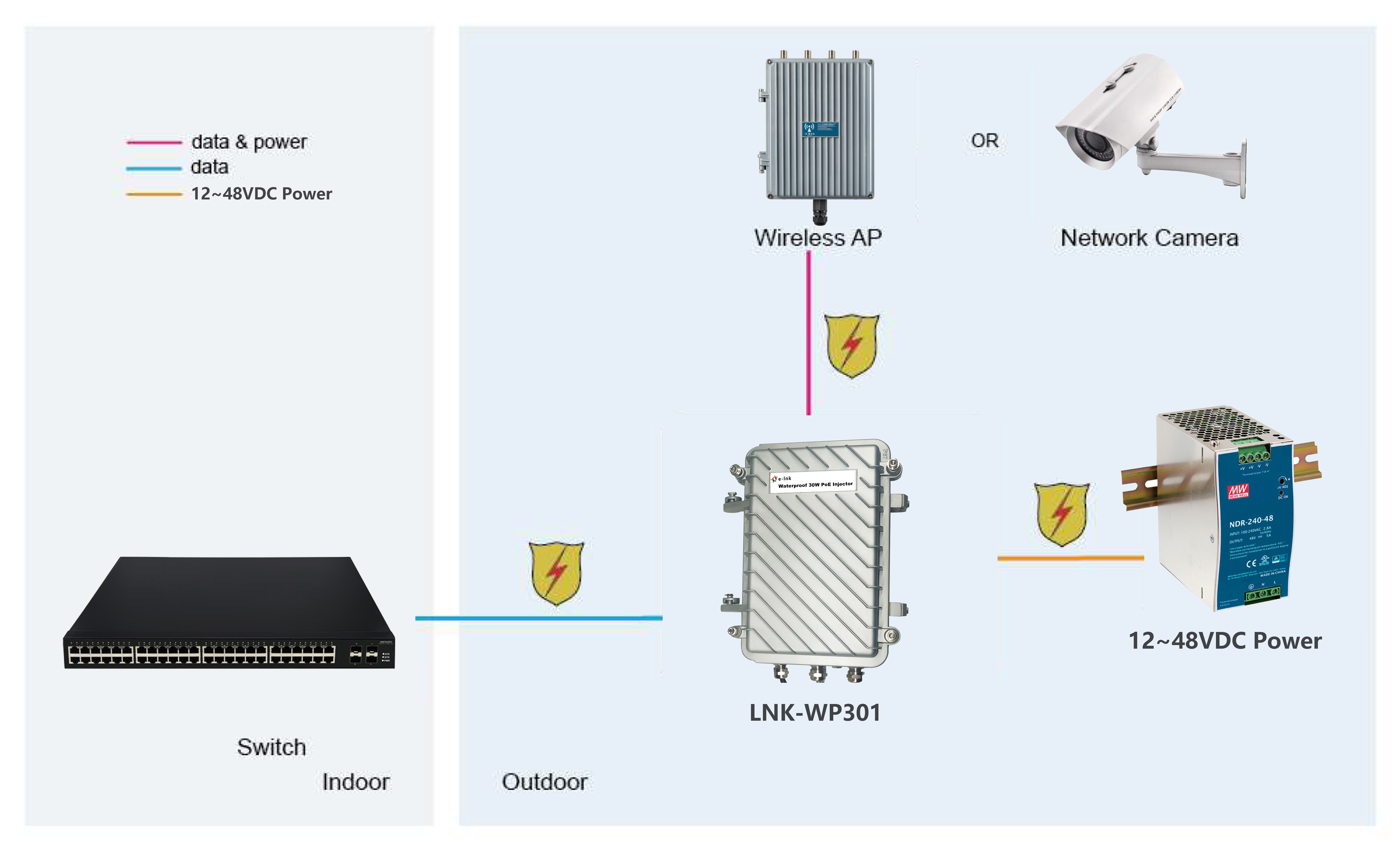 LNK-WP301 provides 30W PoE power for remote PDs over 2 pairs output with 6KV (10/700us) surge protection, fully compliant solution for outdoor installations, guaranteeing 30 Watts of power and ensuring safe and reliable operation in outdoor environment of any standard PoE data terminal. It allows wireless LAN access points, security network cameras and other IP terminals to receive power, a long with data, over standard Ethernet cables, leaving network infrastructure completely unaltered.