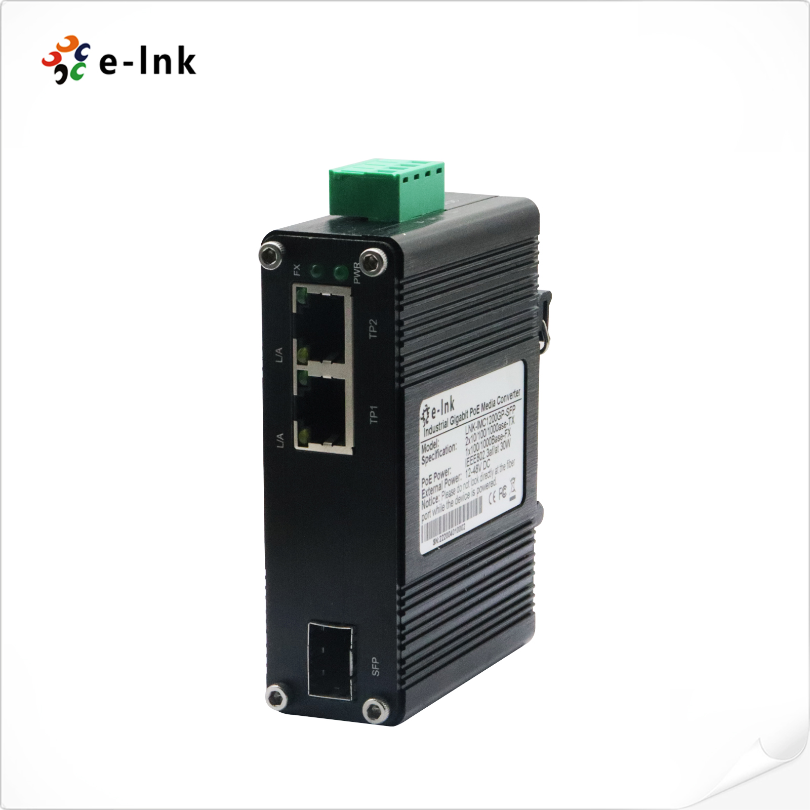LNK-IMC1200G-SFP Series is a DIN rail type Media Converter that supports external SFP Modules and meets EN55022 standard. It is a hardened grade product whose operating temperature range is -40°C to +75°C. LNK-IMC1200G-SFP supports 10/100/1000Base-T and 100/1000Base-X SFP Port. The Ethernet port supports both half-duplex and full-duplex mode. Users can use different type of SFP modules (single-mode/multi-mode fiber, 1/2 core) as needed.