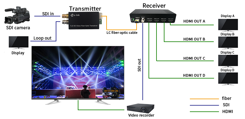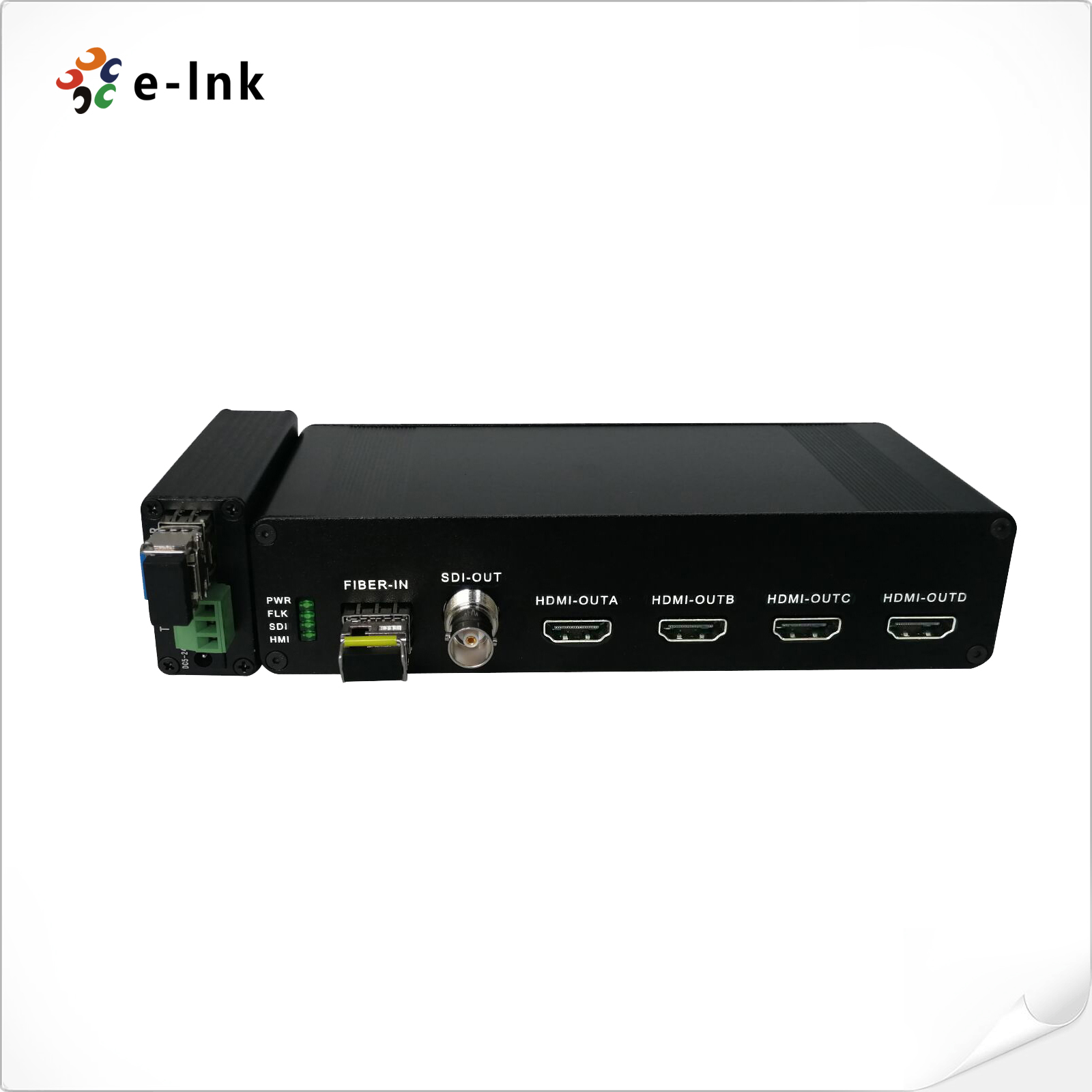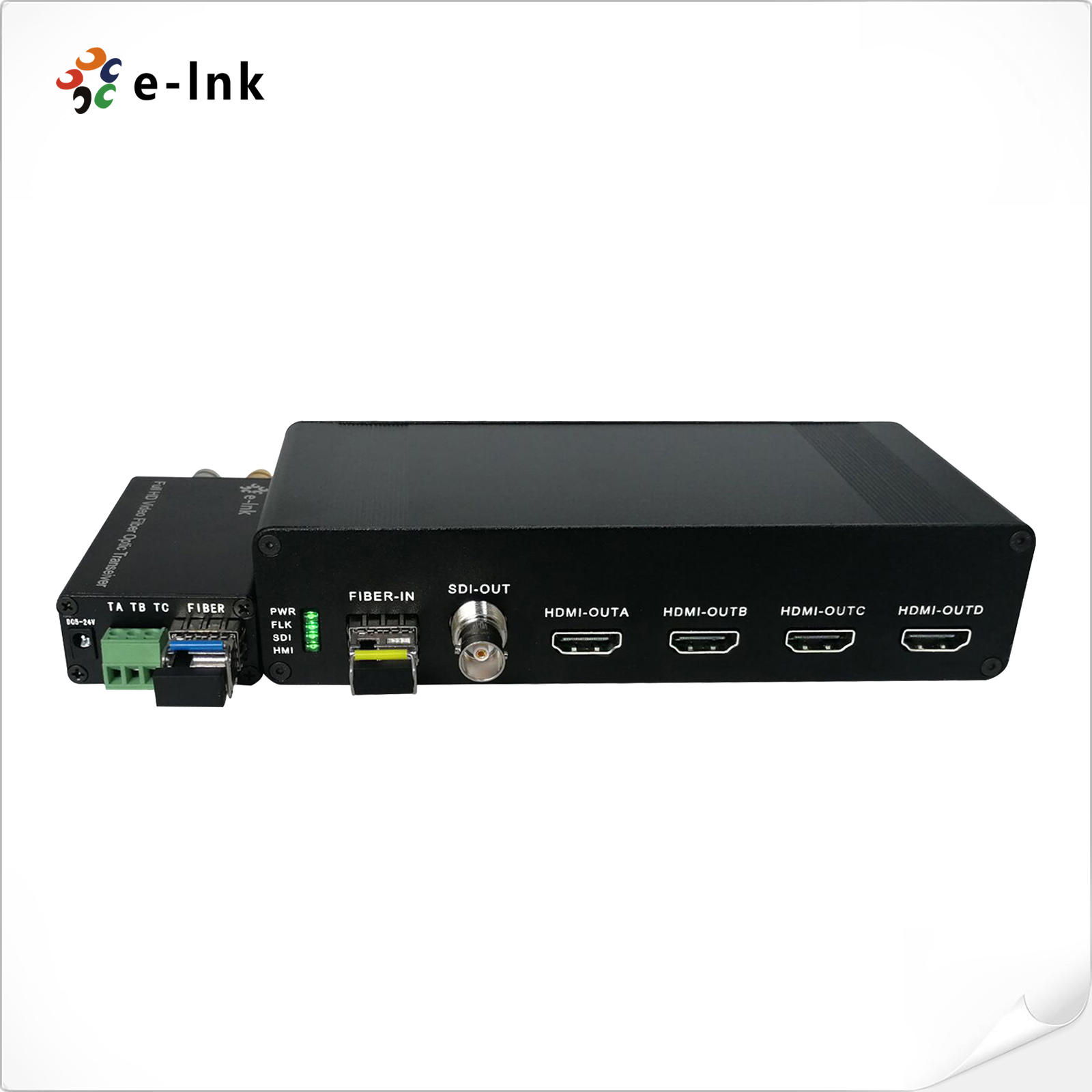 LNK-3G-1V4H Series 3G-SDI Fiber Extender supports 1-channel 3G-SDI Video(audio embedded)transmitted via fiber optical cable, and monitor the signal locally over a 3G-SDI loop output. E-link 3G-SDI Video over Fiber Converters includes one transmitter with loop out and one receiver with 1Ch 3G-SDI and 4Ch HDMI Output.