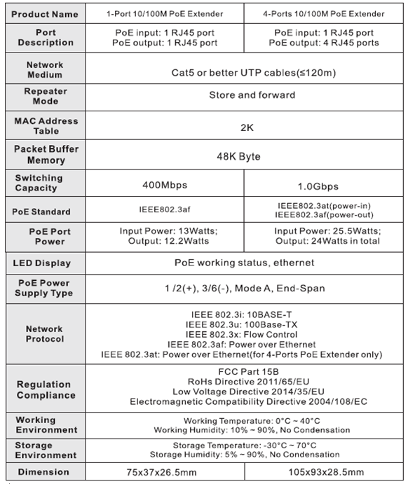 This 4 Ports PoE Extender has 5 10/100M PoE ports, among them, 1 port for power input, and others for power output. Comply with 10/100BASE-TX, IEEE802.3at (power-in) /IEEE802.3af(power-out). The power input is 25.5W in total. Power output for single port is 15.4W( max).
