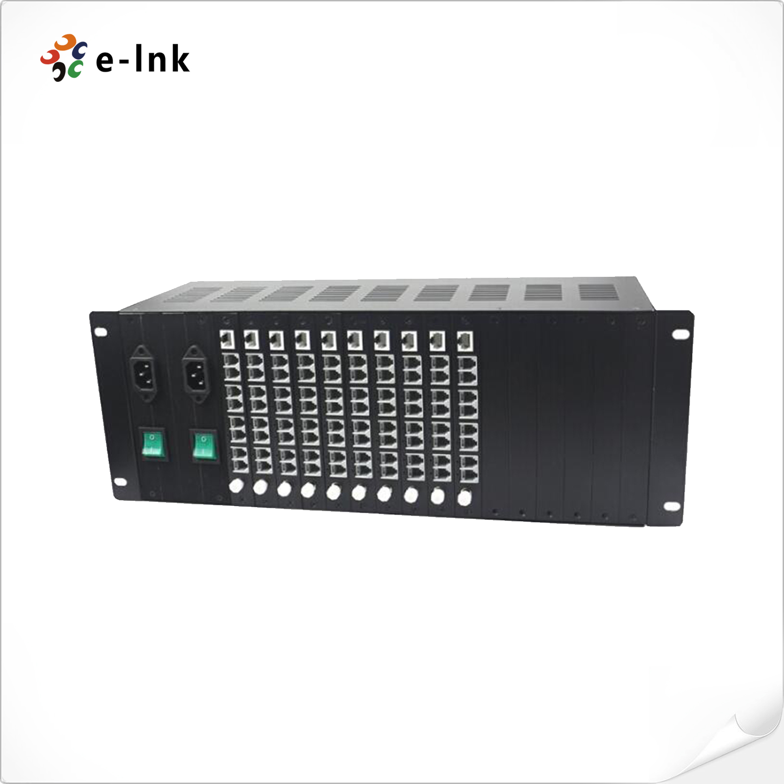 The LNK-PR-4U chassis can accommodate a combination of up to 16 pieces E-link card-type 4Ch or 8Ch telephone fiber mux modules. It makes your installation easier. The chassis employs a 110/220 VAC Switch Mode Power Supply(SMPS) design, which reduces the possibility of a single module failure causing a shutdown or a major failure of other modules within the chassis. The high reliability and stability ensures that if one module shuts down, the operation of the other modules remains unimpaired. 0ne or two air-cooling fans are installed inside to further strengthen the superior performance of the system and eliminate the necessity for periodic maintenance. Status information can be read through the LED indicators on the installed modules. All of the modules installed in the chassis are hot swappable, which makes it unnecessary to power-down the chassis when replacing modules.
