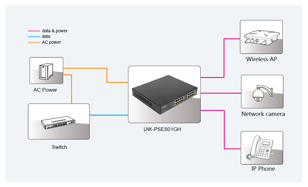 LNK-PSE801GH is designed for indoor use. It works with input voltage of 176-265Vac. It has detection chip inside, which will detect and classify PD before powering it. It will not apply power until a standard-compliant PD is detected. The effective distance is 100 meters over Cat5e/Cat6 cables. With the Midspan's plug-and play installation Desktop or Rack-mounted or Wall-mounted , power and data can be delivered easily while it is cost-effectively.Features