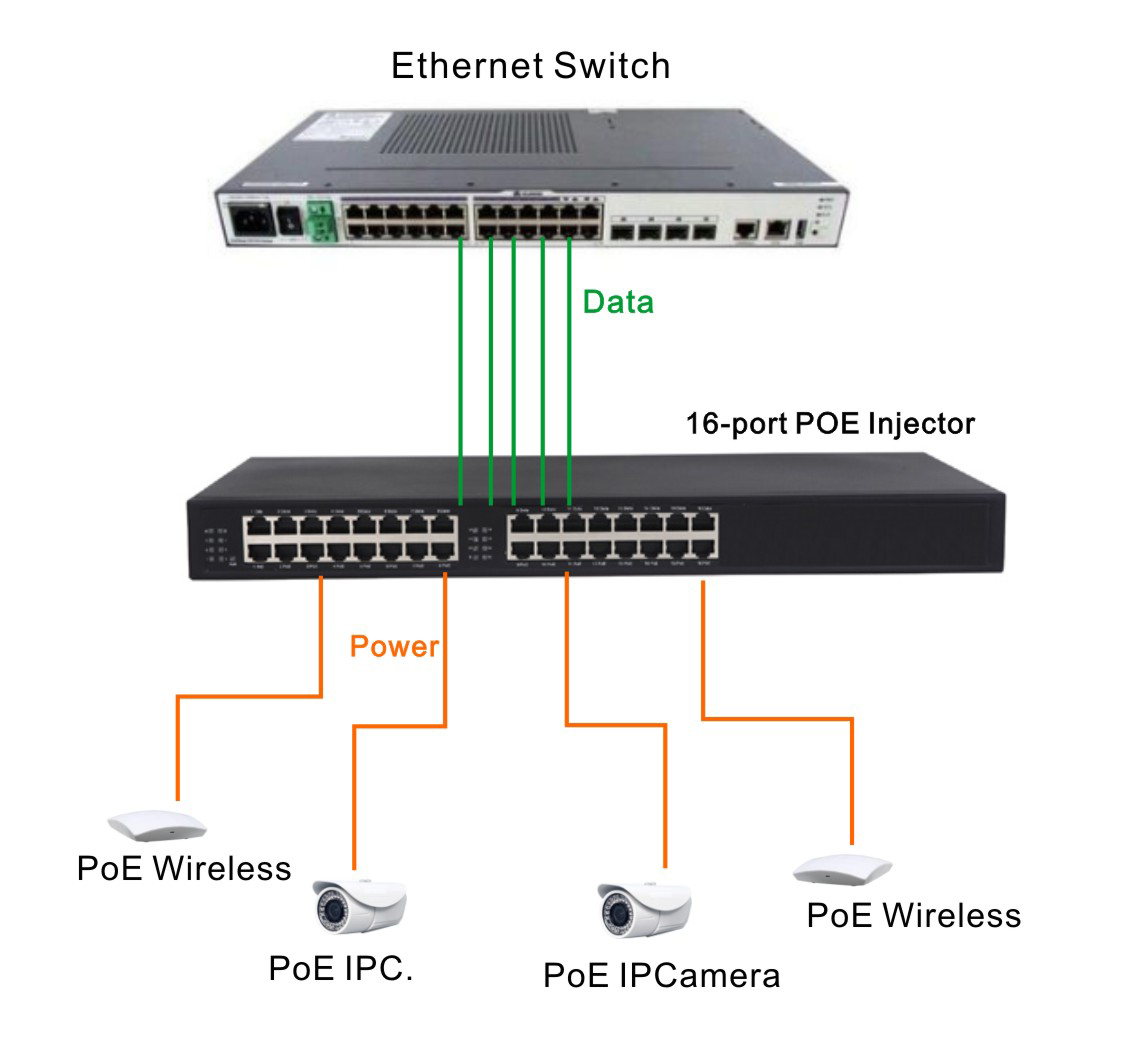 E-link 16 port PoE injector, strictly conforms IEEE802.3af/at standard, its single port supports 60 watts maximum power. This PoE injector can coordinate the applications of traditional network system/security product/LED light. It transmits signal and electric power to terminal devices by using CAT5 or CAT6 cables,and then make the traditional wiring more simple, convenient, safe and reliable.