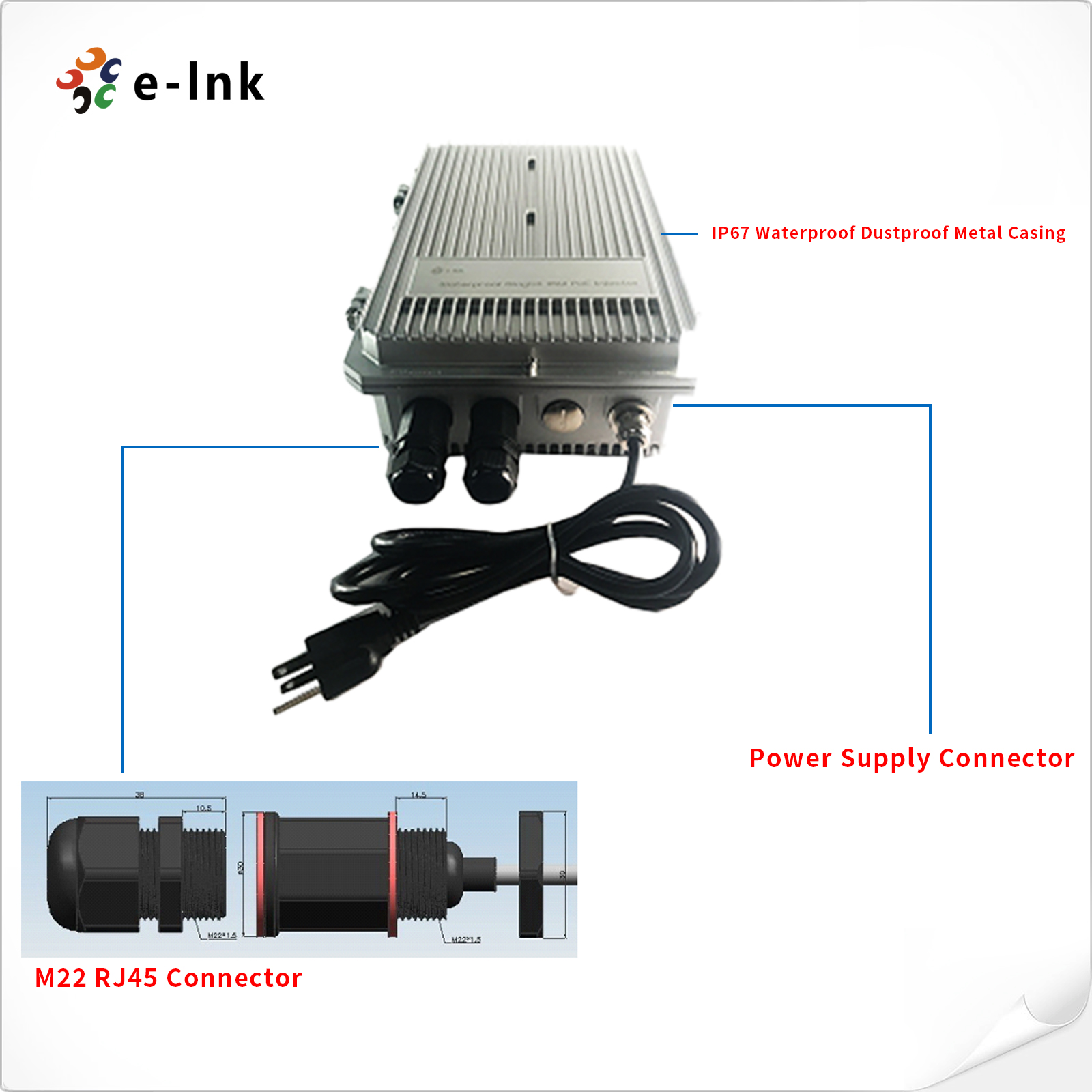 E-link LNK-IPOE-95W Industrial IP67-rated Single-port 802.3bt PoE Injector provides a maximum of up to 95 watts for each PoE output port, transmitting both the Gigabit Ethernet data and 802.3bt PoE power over the UTP cable. It is specifically designed for such outdoor powered devices (PDs) as PTZ network cameras, PTZ speed dome cameras, multi-channel (11a/b/g/n) wireless LAN access points and other network devices that need a higher power to work stably.