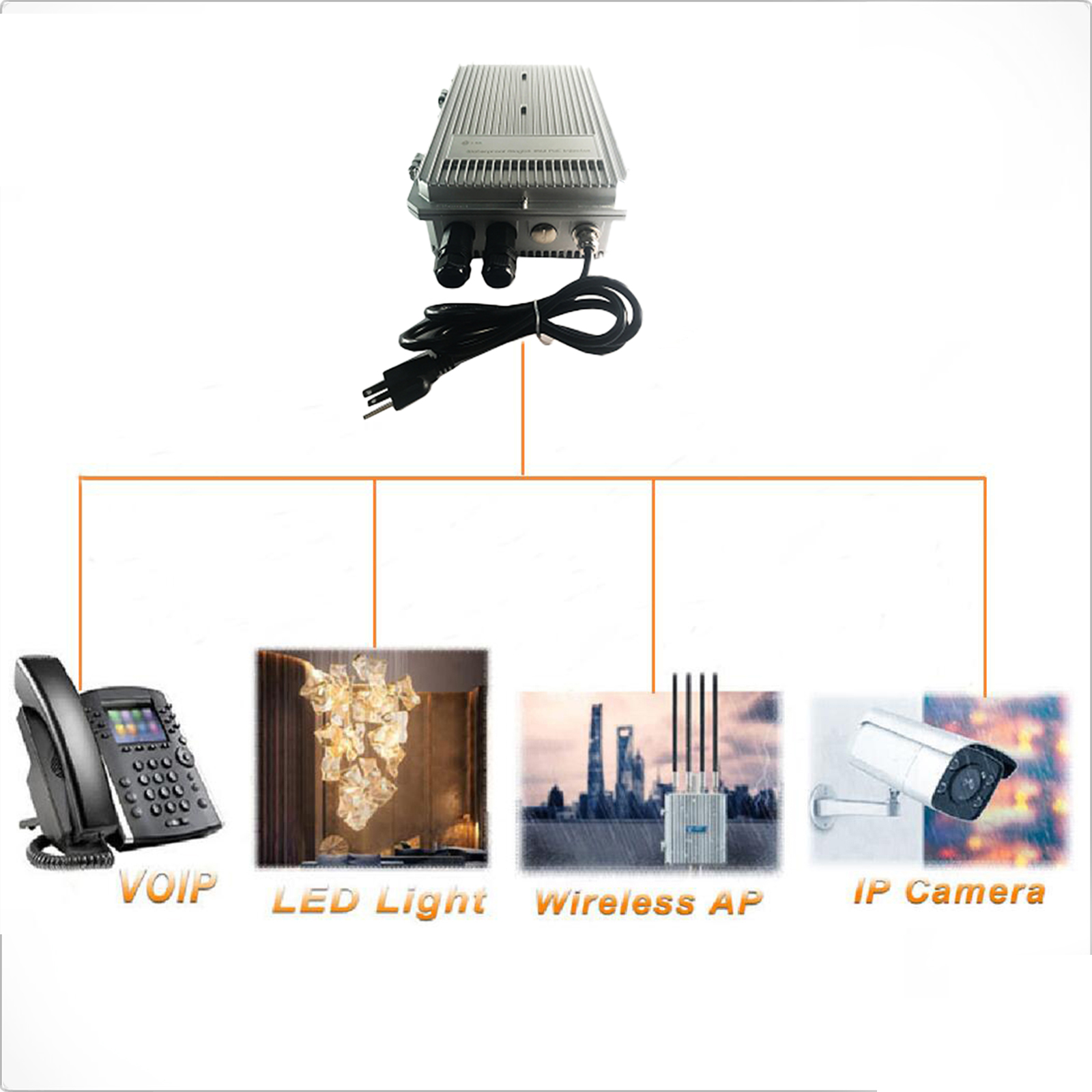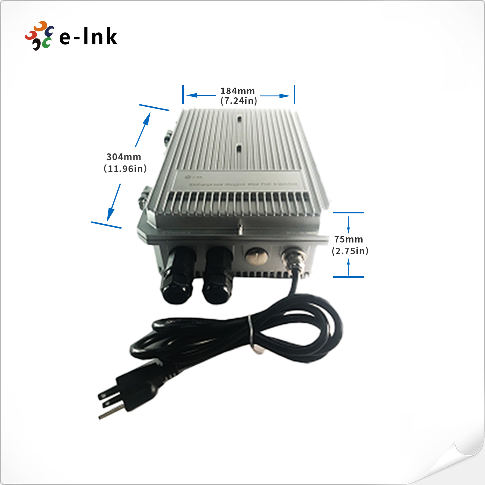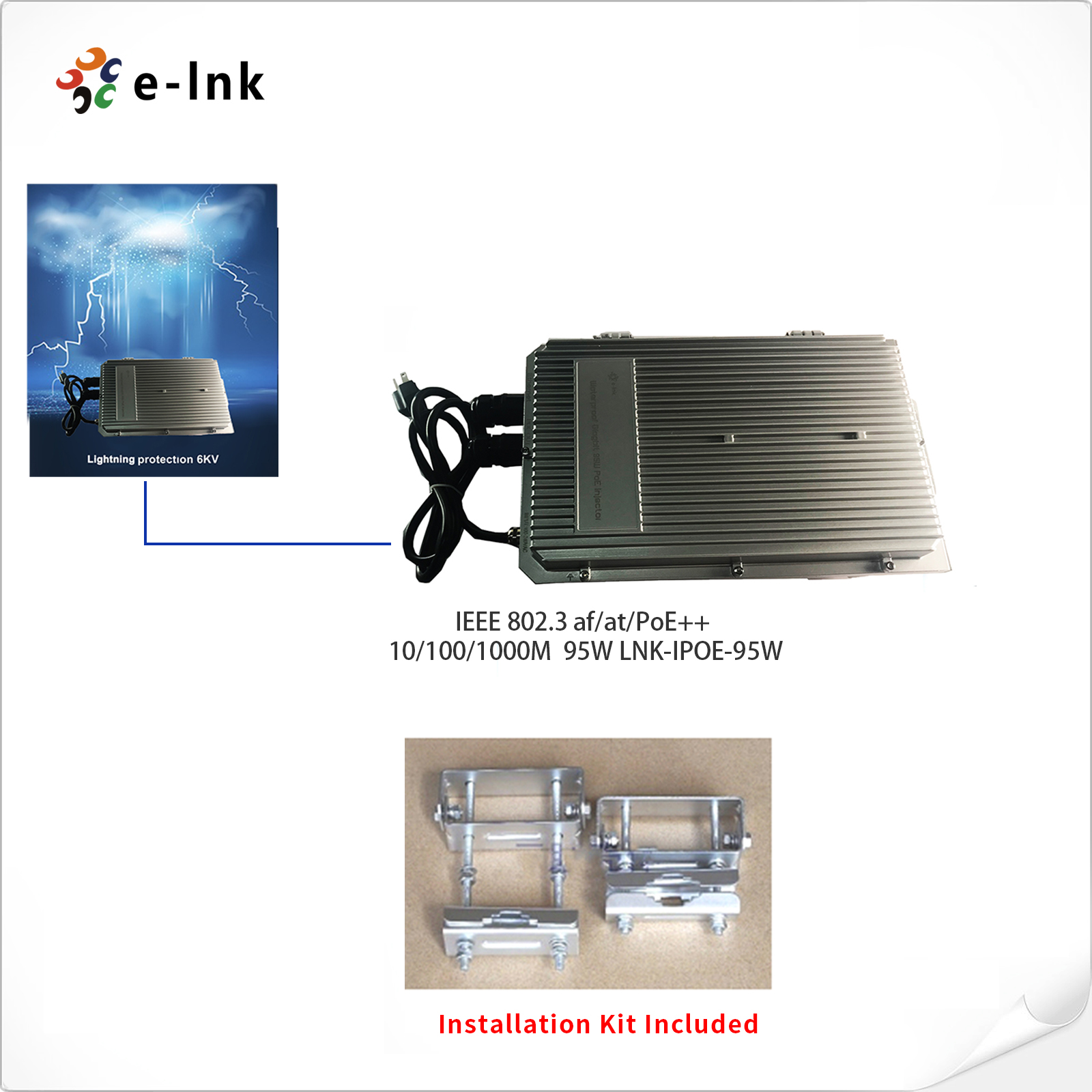 LNK-IPOE95W is designed for outdoor using, which works with 90-264VAC input. It has detection chip inside, which will detect and classify PD before powering it. It will not provide power until a standard-compliant PD is detected. The effective distance is 100 meters over Cat5e/Cat6 cables. It is especially suitable for working in complex power situations. It is easy to install with installation kit LNK-POT-MBK, no need to open equipment.