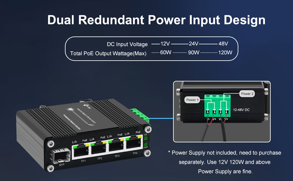 ► Up to 120-watt PoE budget (48VDC), 90-watt PoE budget (24VDC), 60-watt PoE budget (12VDC)