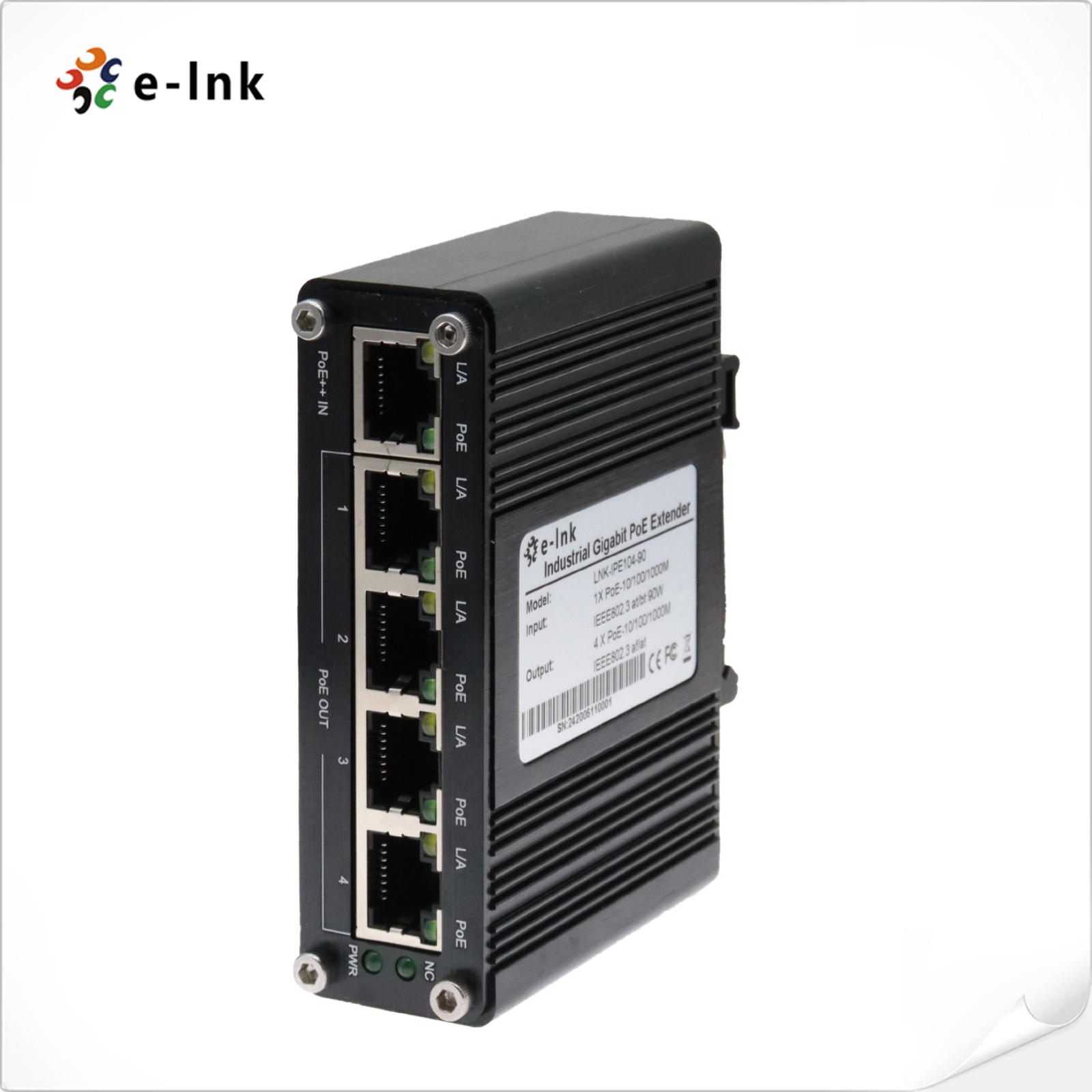 LNK-IPE104-90 is an industrial 1-Port 802.3bt PoE++ to 4-Port 802.3af/at Gigabit PoE Extender designed especially for the point to multipoint PoE application. The LNK-IPE104-90 can obtain a maximum of 95-watt PoE power from 802.3bt PoE++ input port and supplies a maximum of 75-watt PoE power budget for 4 PoE output ports, extending both the reach of Gigabit Ethernet Data and IEEE 802.3at Power over Ethernet over the standard 100m (328 ft.) Cat. 5/5e/6 UTP cable to 200m where up to 4 powered devices (PDs) can be powered at the same time. The LNK-IPE104-90 provides a simple solution for adding PoE ports without running more cabling and achieves more flexible network applications without requiring an external power adapter.