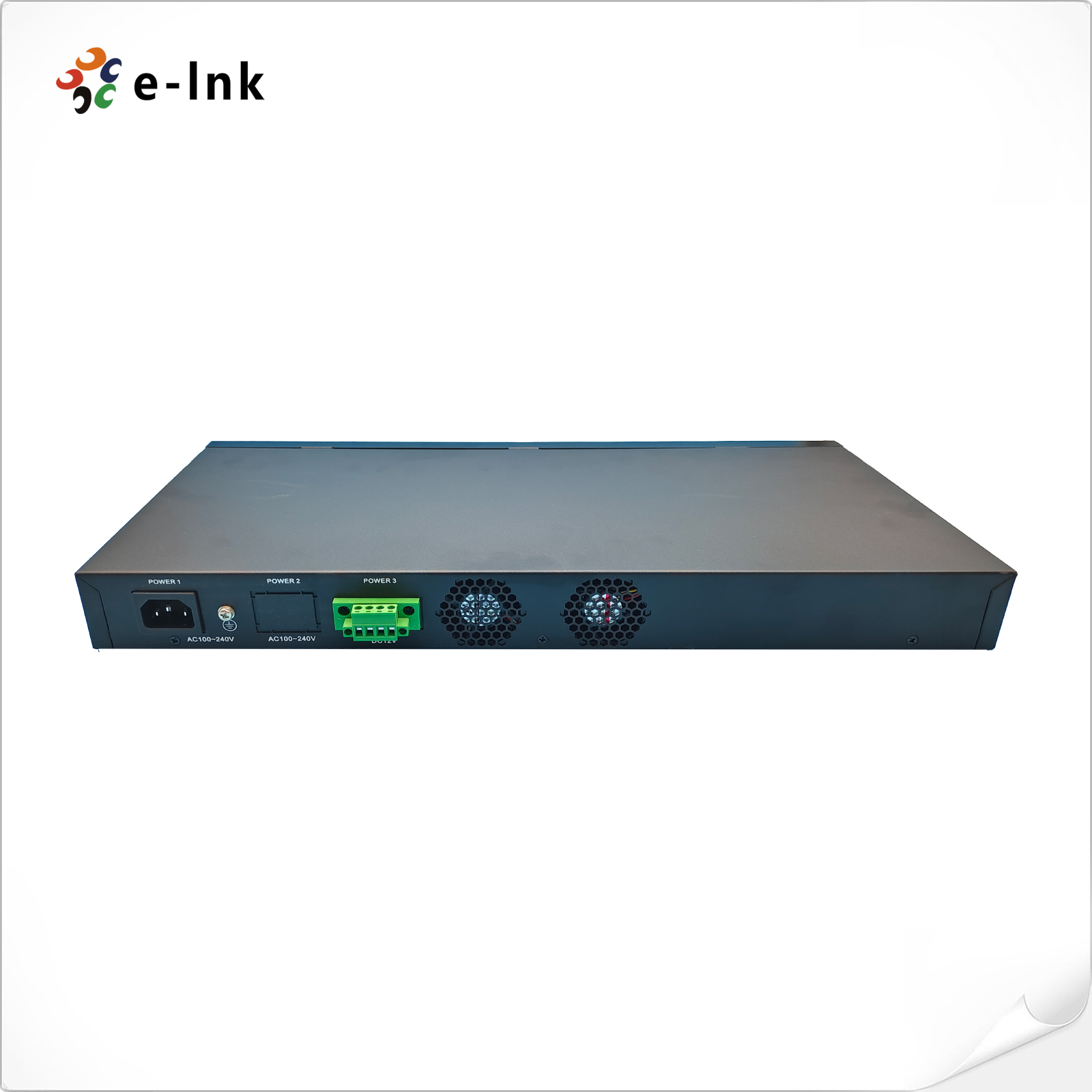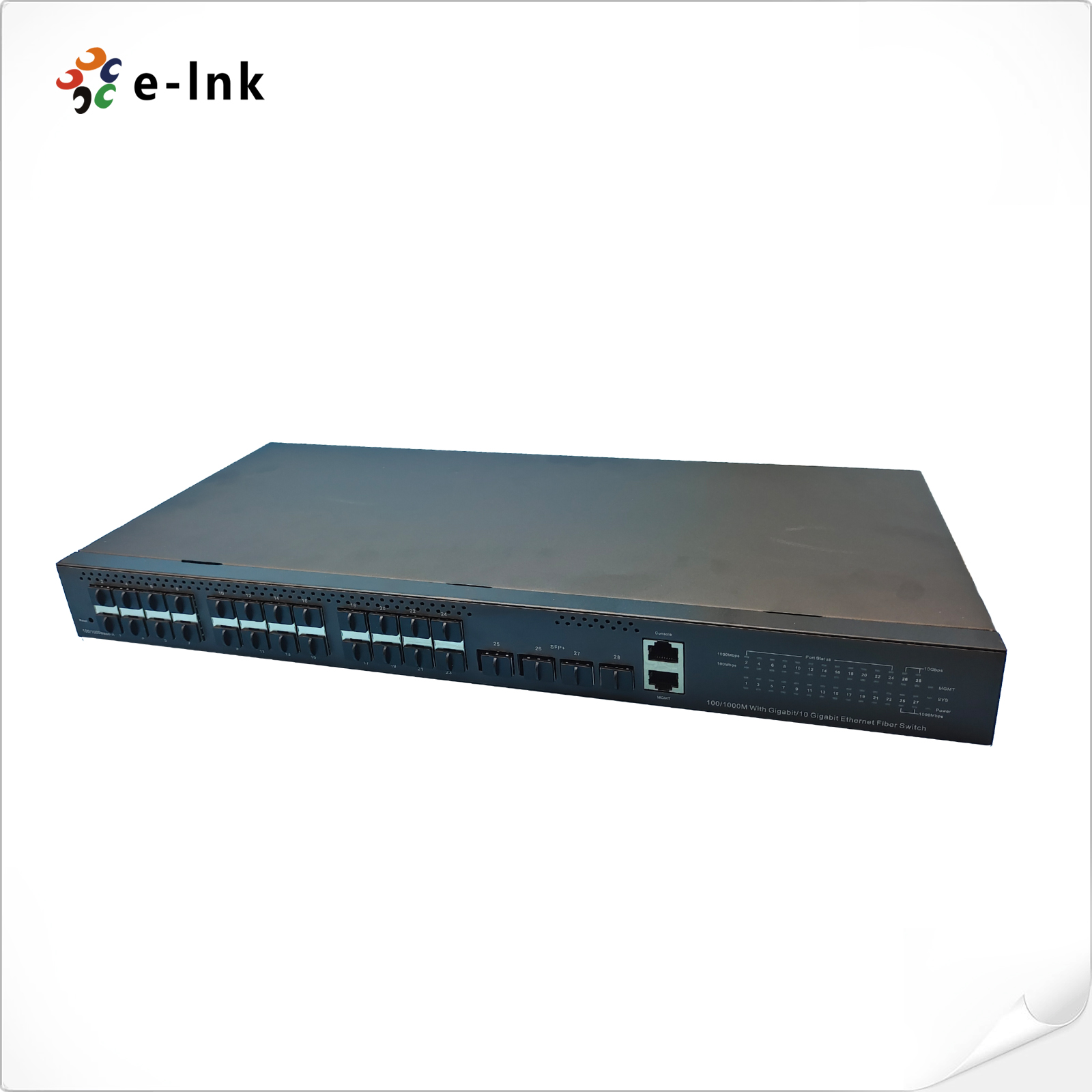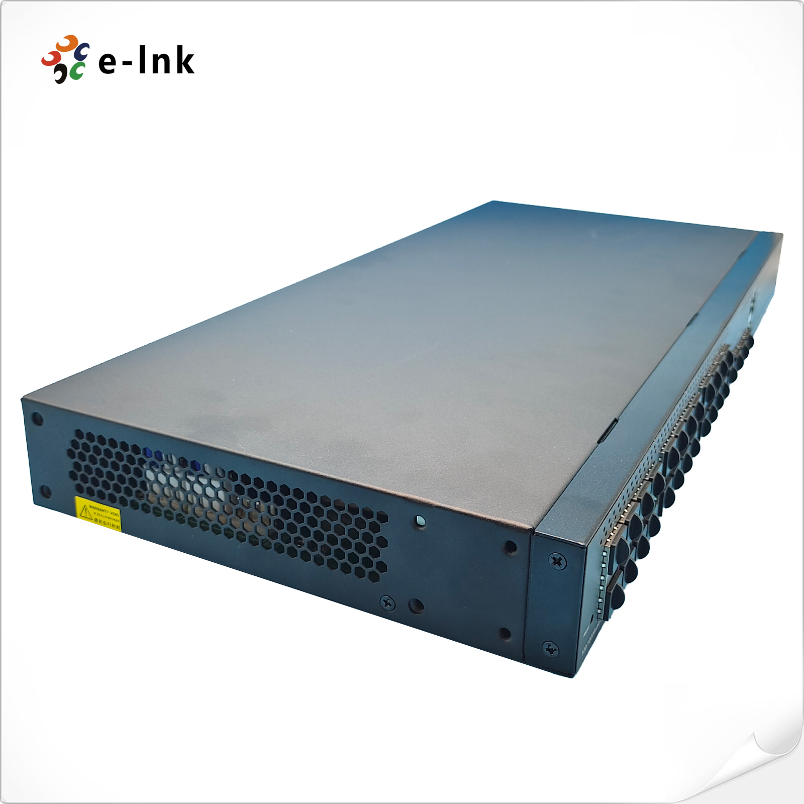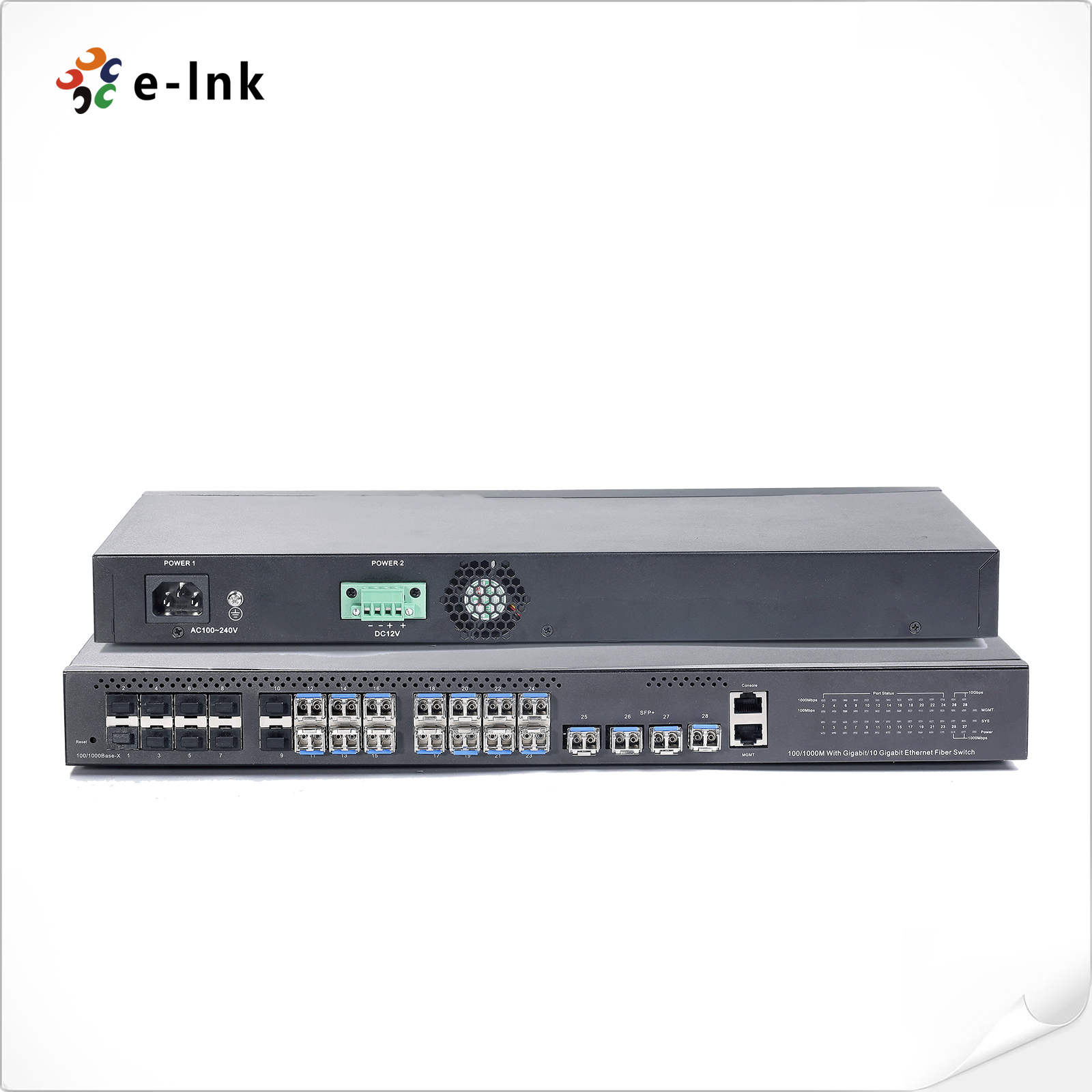 E-link LNK-FS2404X is a 28 port 1000M/10G fiber switch, with 24 1000M SFP fiber ports and 4 10G SFP+ ports (1000M SFP or 10G SFP+) uplink.