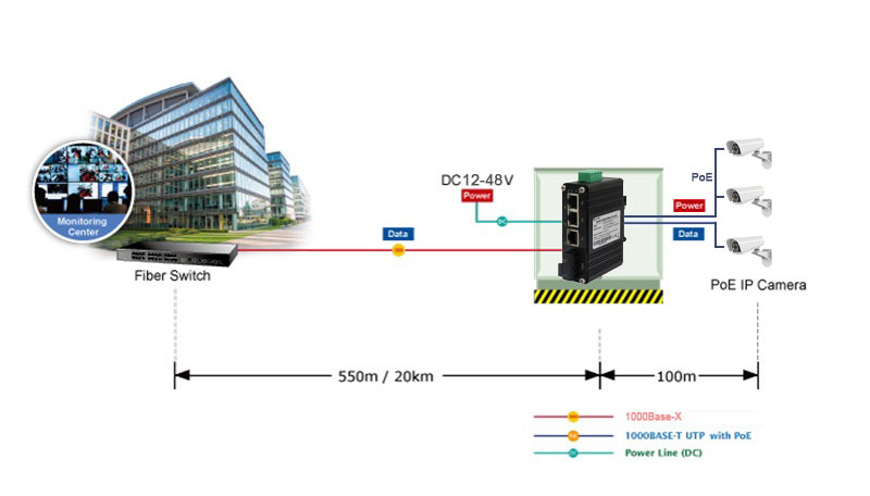 Mini Industrial 3-Port 10/100/1000T 802.3at PoE + 1-Port 1000X SC Gigabit Ethernet Switchwith 12~48VDC Input and Voltage Booster, SC Fiber Port,Multimode, Dual Fiber, 850nm, 550m |