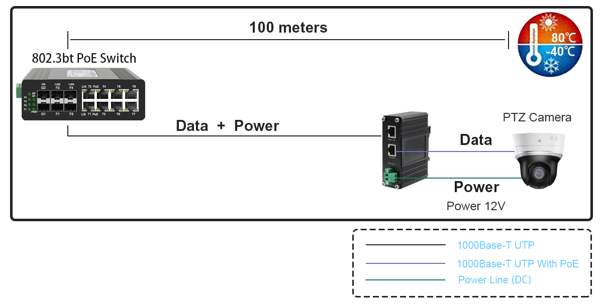 | LNK-INS901 Series | Industrial 10/100/1000Mbps 802.3bt PoE++ Splitter, Output Voltage 12V 19V 24V 36V DC, standalone, Support DIN-Rail mounting and Wall mounting installation, -40 to 80°C operating temperature |