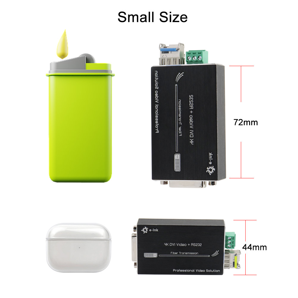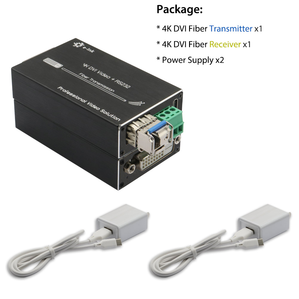 Mini DVI Fiber Extender: 1-Ch DVI Signal(4K*2K) + Backwards RS232, Single-mode Fiber, 20km, LC, including 1 transmitter & 1 receiver, 5V DC Power Input |