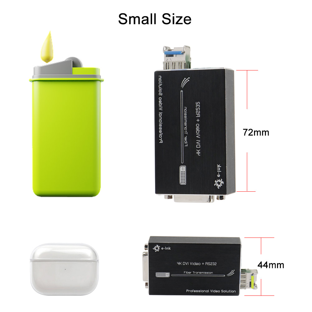 Mini DVI Fiber Extender: 1Ch DVI Signal(4K*2K) + 1Ch Stereo Audio, Single-mode Fiber, 40km, LC, including 1 transmitter & 1 receiver, 5V DC Power Input |
