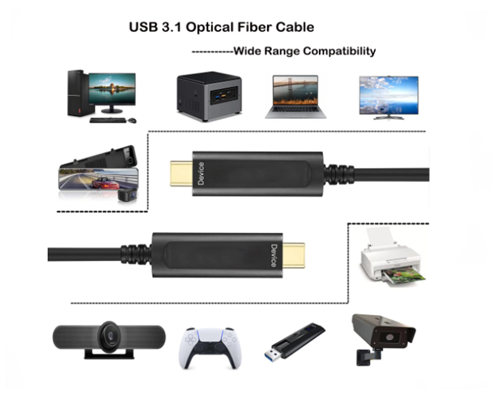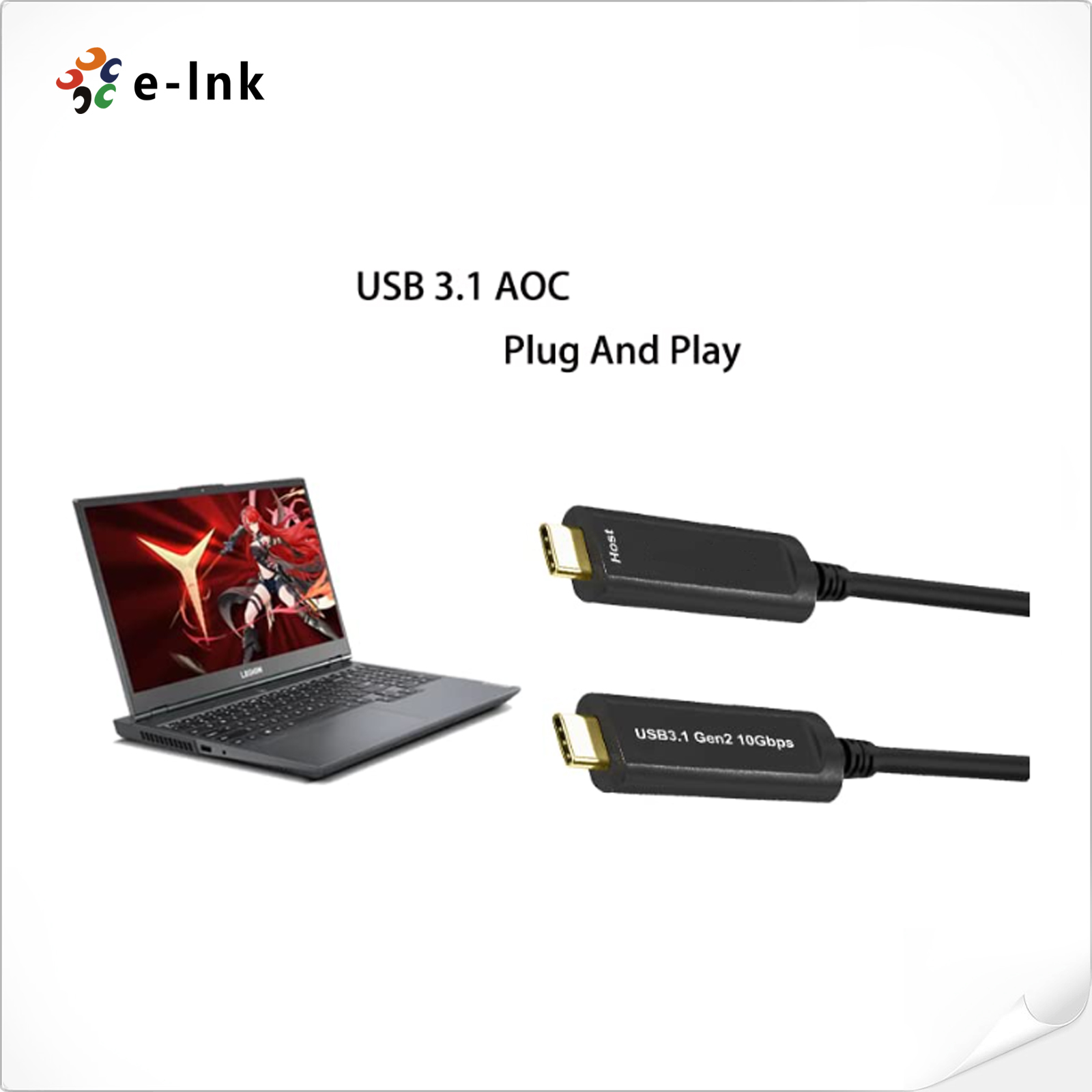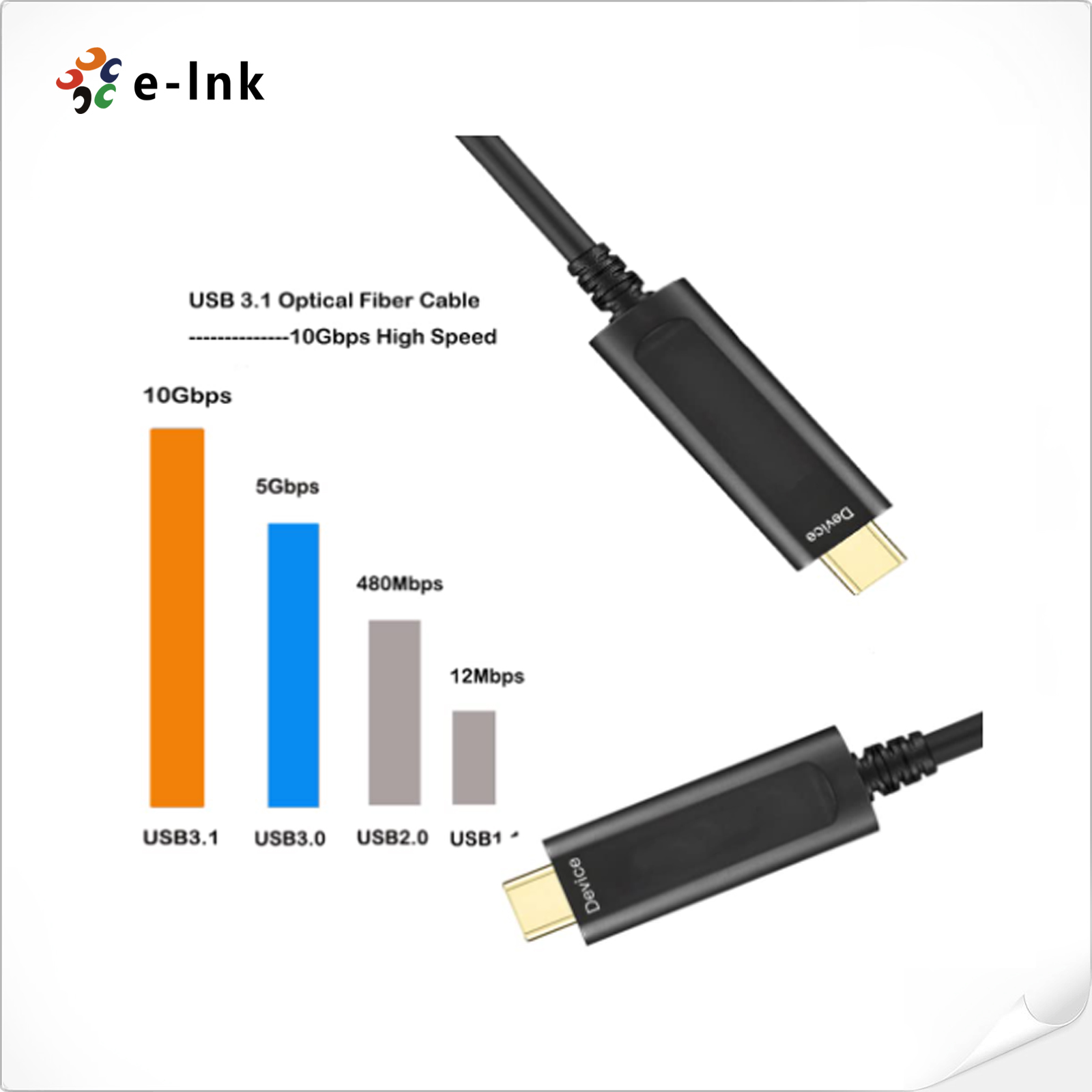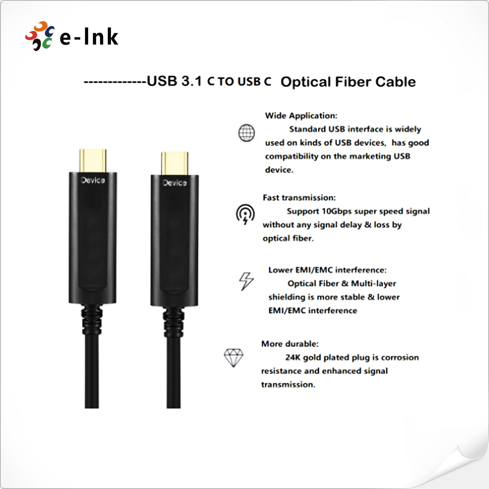E-link USB 3.1 fiber optical cable Under the help of optical fiber design, cable OD only 4.8mm, easy for installation, support plug & play, no need external power supply. And has lower EMI interrupt, and without signal loss at high-speed signal transmission. Different USB devices with comprehensive compatibility testing before shipment, has perfect compatible with most USB device.
