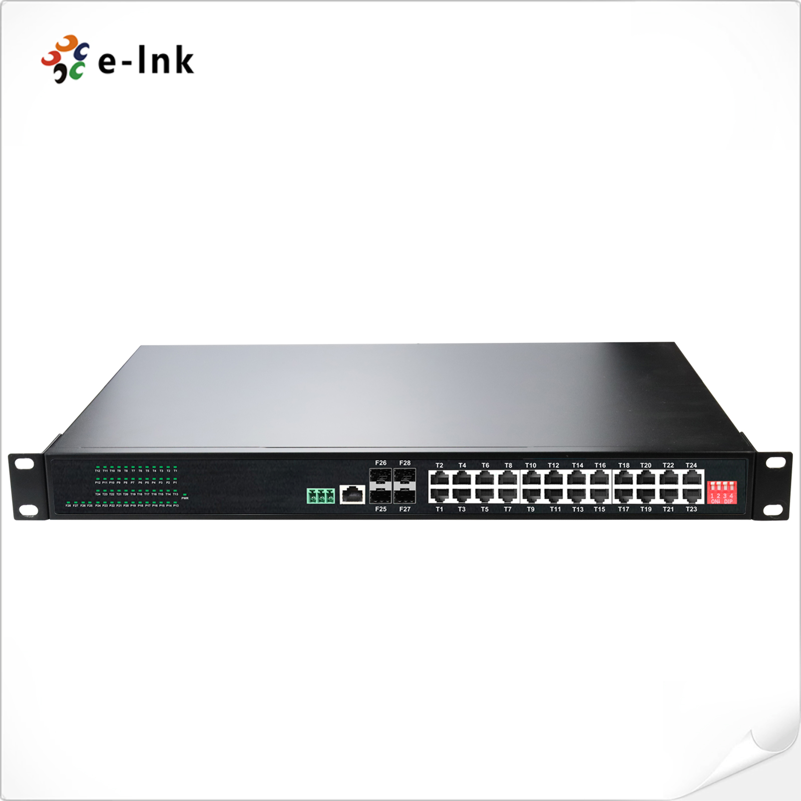 ETH-IMC2424M series is the L2+ managed rackmount 24-port 10/100/1000Base-T + 4-port 1000Base-X SFP hardened Ethernet switch. The switch has 24 TP ports and 4 fiber ports. The TP (RJ45) supports 10/100/1000Base-T(X), Full/Half duplex mode, and auto MDI/MDI-X connection; the 1000Base-X SFP port supports 1 or 2 core Single-mode or Multi-mode fiber. With its reliable design and ease of use, the product is a great choice for integrating networks consisting of network devices such as IP cameras and wireless access points between remote locations.