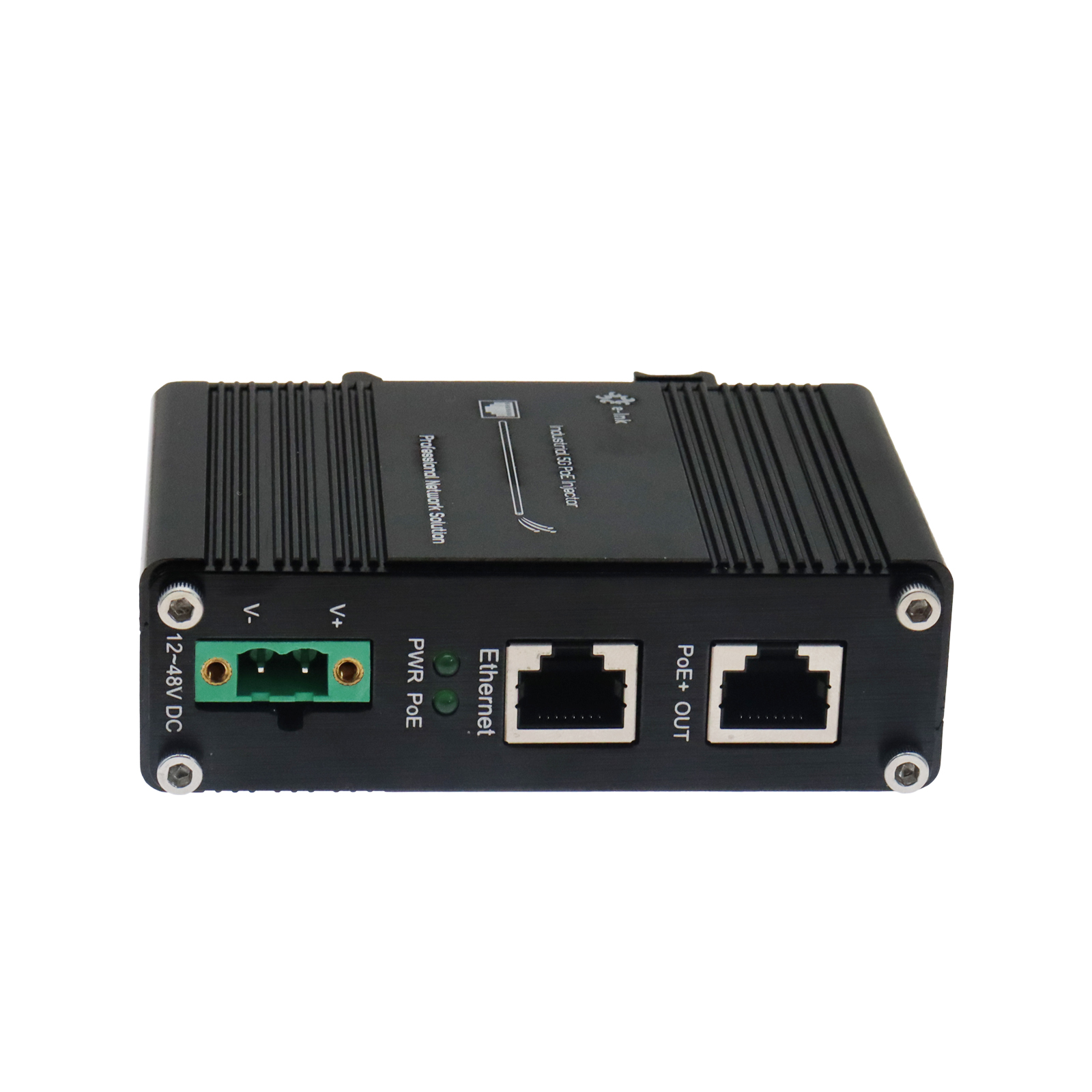 Both the Ethernet port (to switch) and the PoE Out port (to PoE device) support 10/100/1000/2.5G/5G Base-T and are compliant with IEEE 802.3ab. The PoE Out port is also compliant with IEEE 802.3 at.