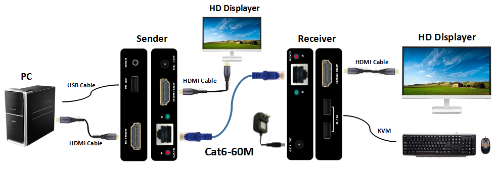 ► Uncompressed transmits HDMI video and audio signals up to 60M over a single CAT6 cable;