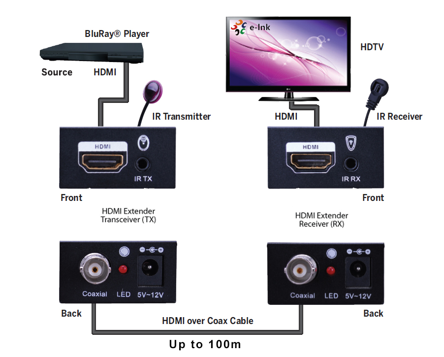 The HDMI + IR Over Single Coax Extender system consists of a Transmitter and a Receiver. The HDMI source (set-top box, DVD player, or gaming console) connects to the Transmitter box with a HDMI cable. The Receiver box connects to the HDTV display in the same way up to 100M (328ft) away. One 75ohm RG-6U Coax cable links the Transmitter and Receiver. Power is applied to the Transmitter and Receiver with the included power adapters.