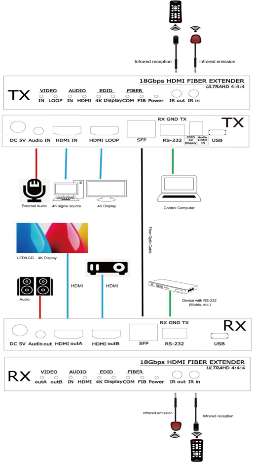 4K HDMI 2.0 4:4:4 Fiber Optic Extender, support bidirectional IR control, RS-232 pass-through, and EDID management for simple and convenient control.