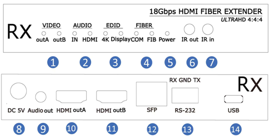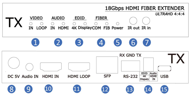 Fiber Connection Indicator (FIB): The FIB indicator remains steadily lit when a normal fiber signal connection is established between the transmitter and receiver. Communication Indicator (COM): The COM indicator remains steadily lit when a normal fiber signal connection is established between the transmitter and receiver. It blinks during EDID learning. |