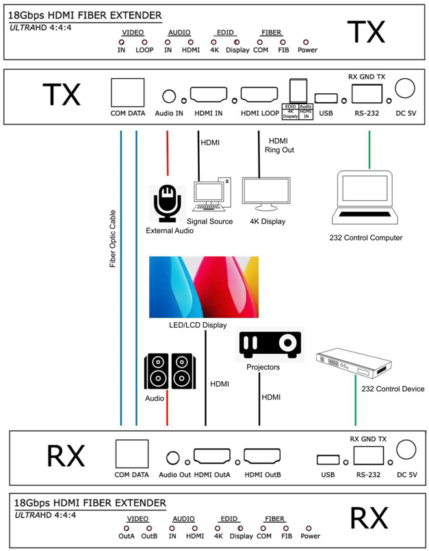 4K 60Hz HDMI Fiber Extender, with Audio, RS232, EDID function, Single Mode Dual Fiber, LC, 10/20/40/60/80KM optional. |