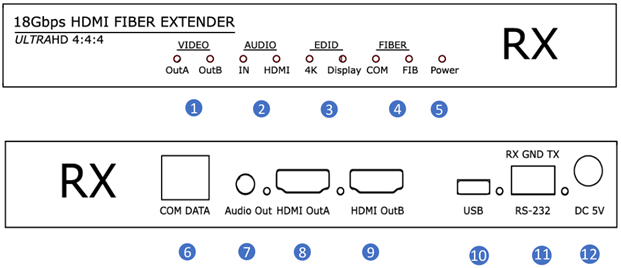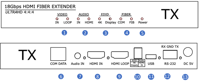 Fiber optic connection indicator light, when the transmitter and receiver establish a normal fiber optic signal connection, the FIB indicator light remains on. COM communication indicator light, when the transmitter and receiver establish a normal fiber optic signal connection, the COM light remains on and flashes when learning EDID. |