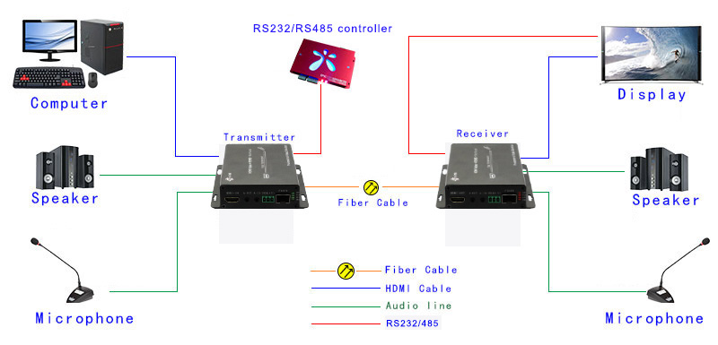 ► Transmits HDMI video signals, RS232/RS485 and audio up to 20km over a single fiber cable;