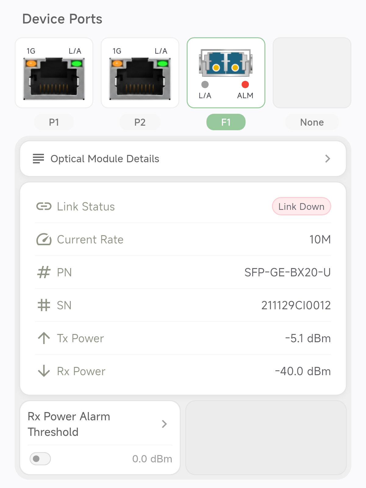 ► One-click screen display: System current, voltage, temperature; Optical module transmit power, receive power; Ethernet/Fiber port rates, etc.