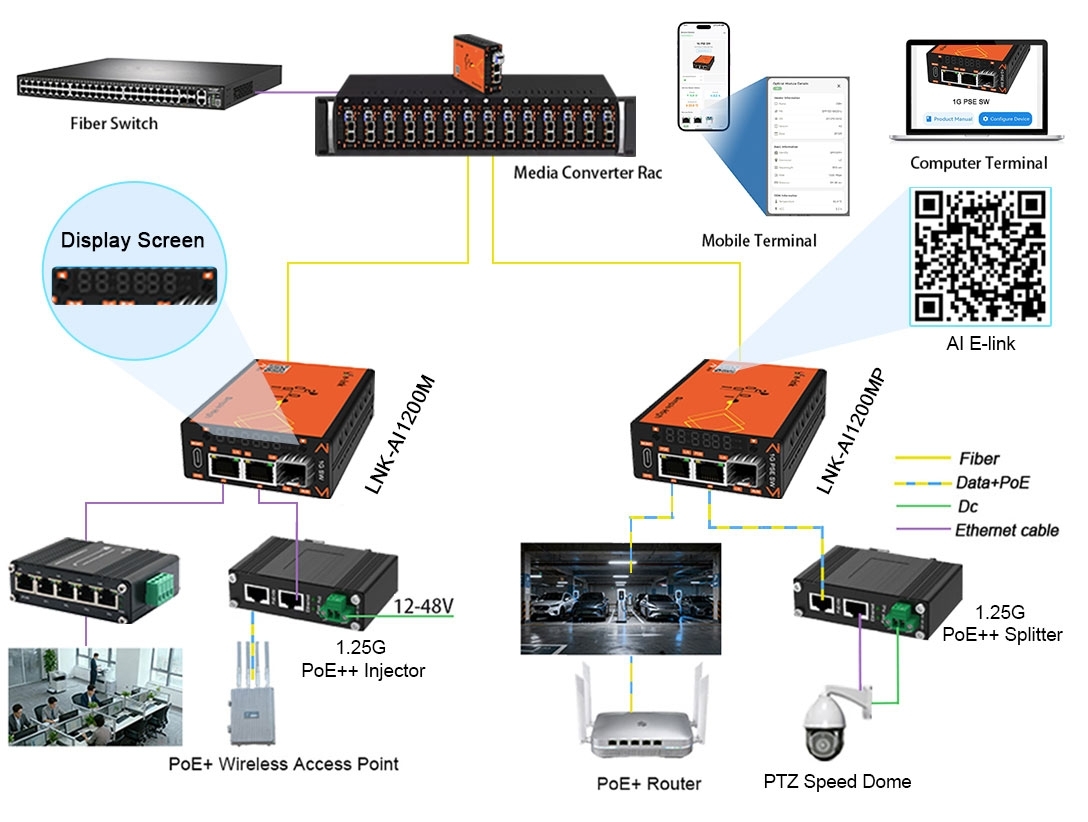The LNK-AI1200MP-SFP Series AI Smart Managed PoE Media Converter is an innovative, independently developed AI-driven device from E-link. It enables intuitive management and real-time monitoring through a mobile app or web interface, eliminating the need for external test equipment. Users can access key operational data, including power status, SFP and Ethernet port conditions, and comprehensive SFP module diagnostics such as optical power, wavelength, transmission distance, data rate, and temperature.