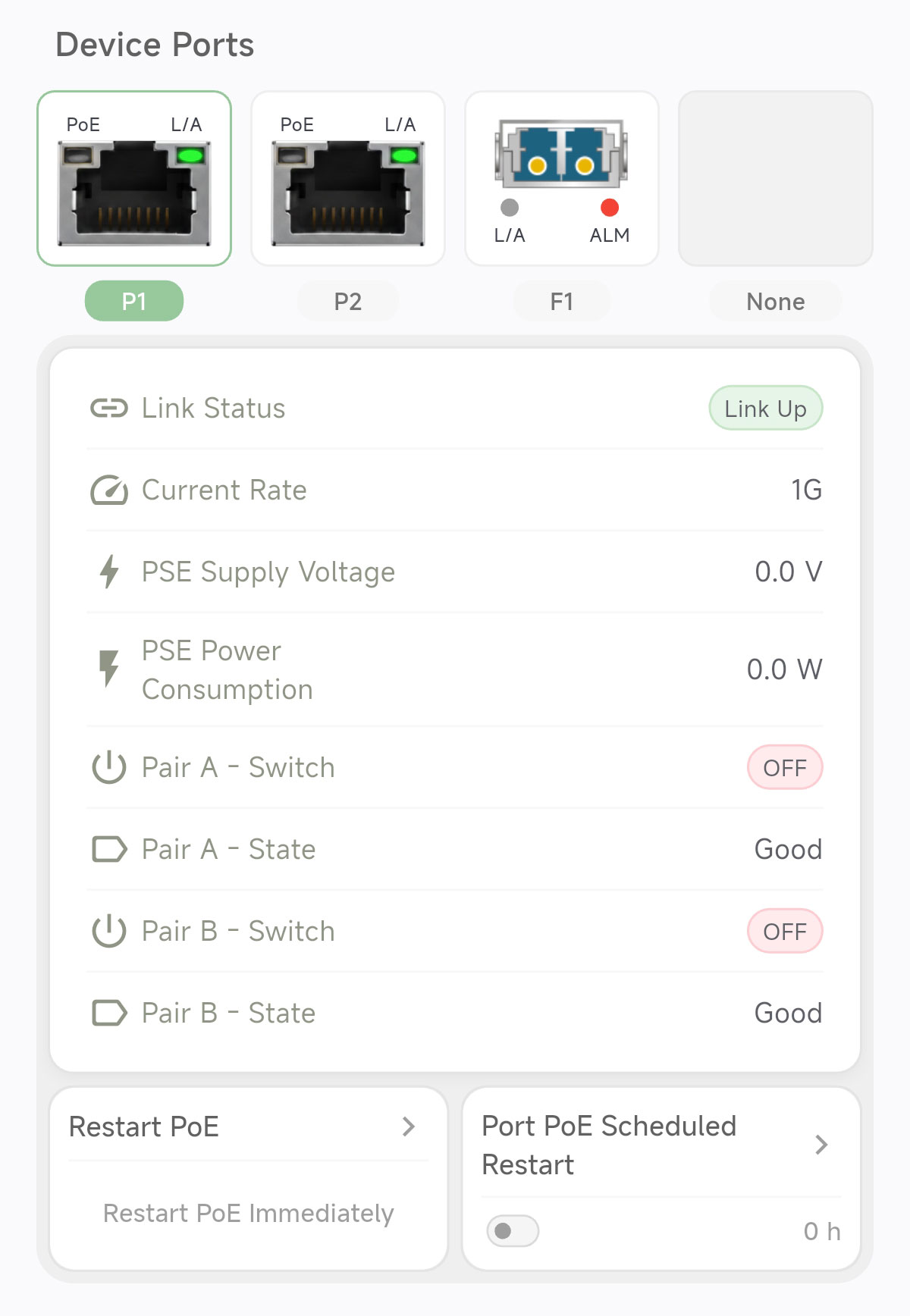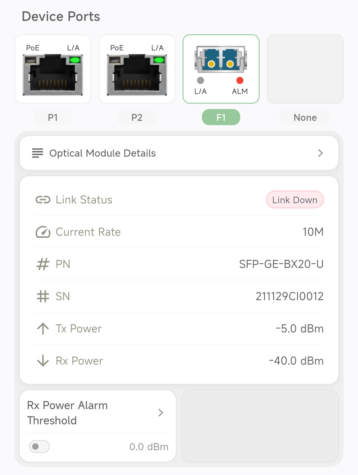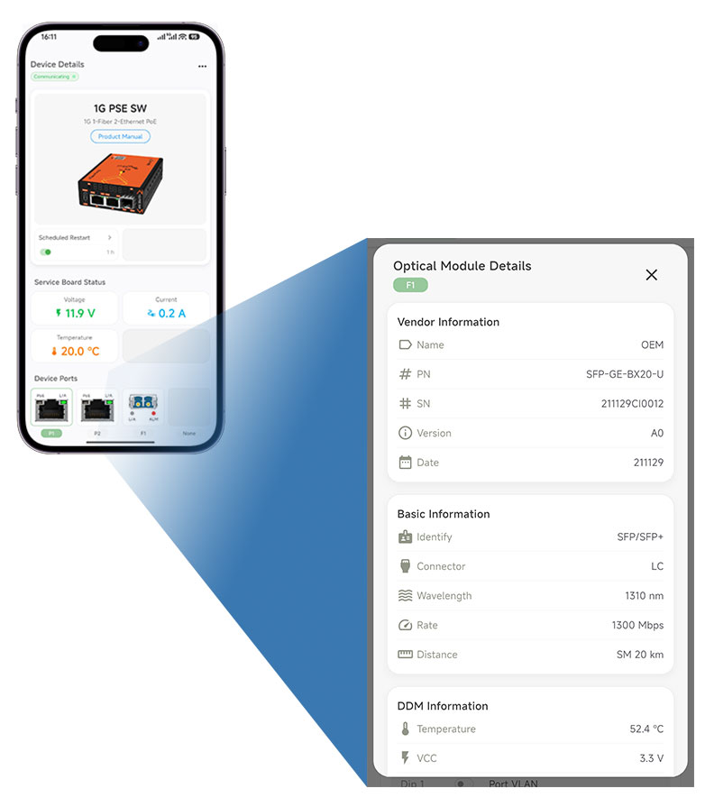 ► APP/Web management functions: Graphical interface presenting detailed device information; SFP module information and DDM data; User-defined optical power thresholds; User-defined scheduled reboot, etc.