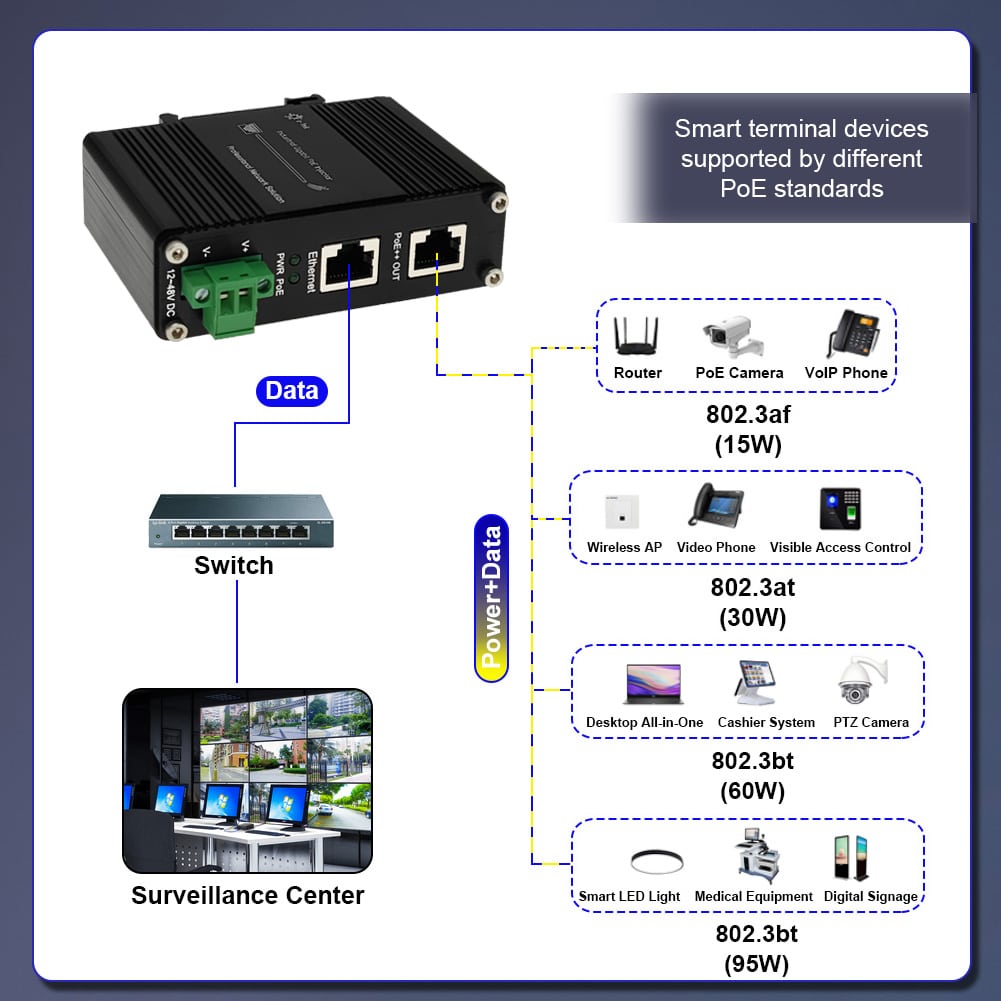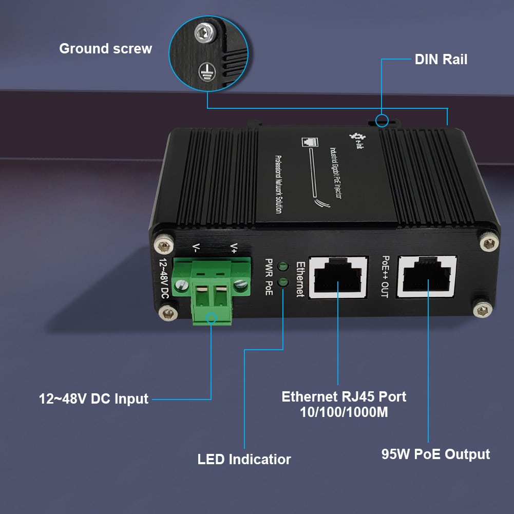A PoE Injector is a device that can simultaneously provide data transmission and power supply through an Ethernet cable. It can connect non-PoE network devices to PoE terminals, solving the problem of separate wiring for power supply. The E-link LNK-INJ301-90 is a typical industrial gigabit 95W PoE++ power supply, supporting a wide input voltage range of 12 to 48VDC. With the power boost function, it can provide stable power to PoE terminals within 100 meters, making it an excellent choice for industrial and commercial scenarios.